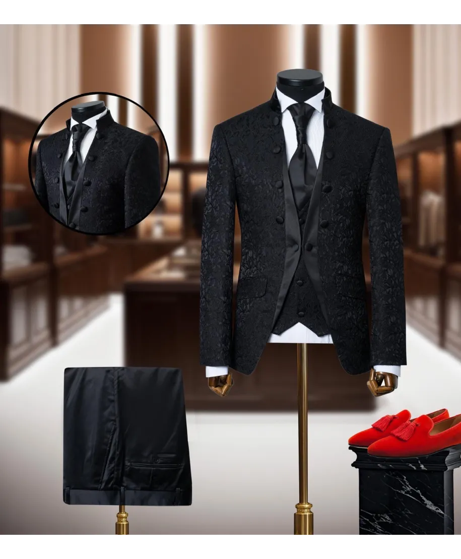 Wyjątkowa elegancja spotyka nowoczesny design – ten abito uomo cerimonia bianco w stylu coreano to idealny wybór dla pana młodego, który pragnie połączyć tradycję z oryginalnością. Wykonany z luksusowej tkaniny o subtelnym wzorze damascato, garnitur emanuje prestiżem i ponadczasowym urokiem. Minimalistyczny kołnierz coreano bez klap dodaje sylwetce smukłości i podkreśla ceremonialny charakter.